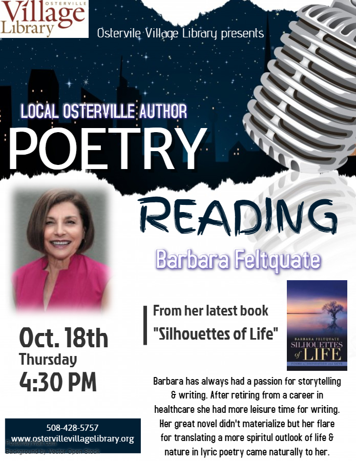 I’m on my way! My local library is launching my book with a poetry reading on Thursday, October 18th. I’m so excited! They are setting me up in their cozy fireside reading room. They informed me that an email blast will go out shortly to all library card holders in their “Clams” network which covers the entire Cape.